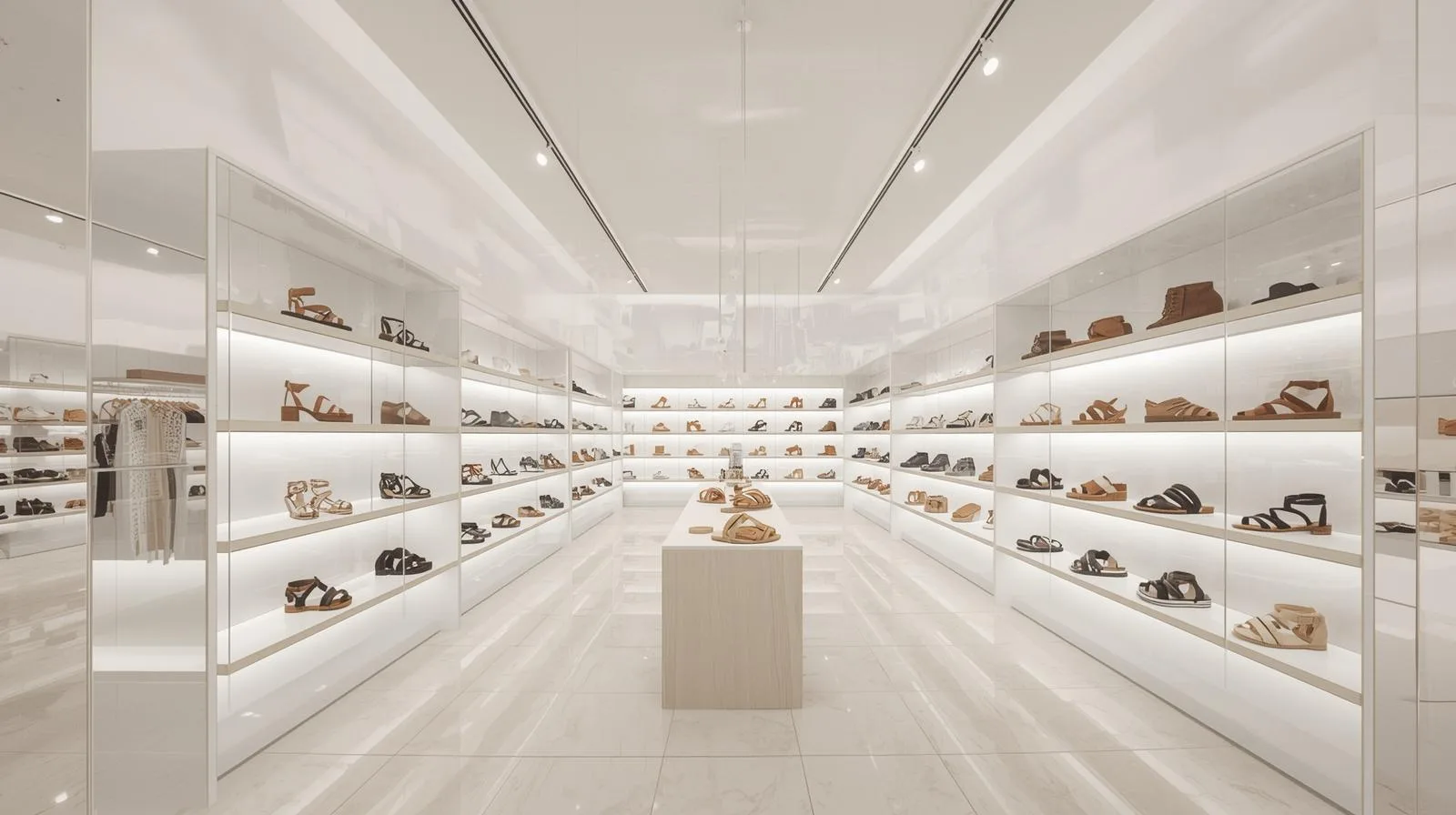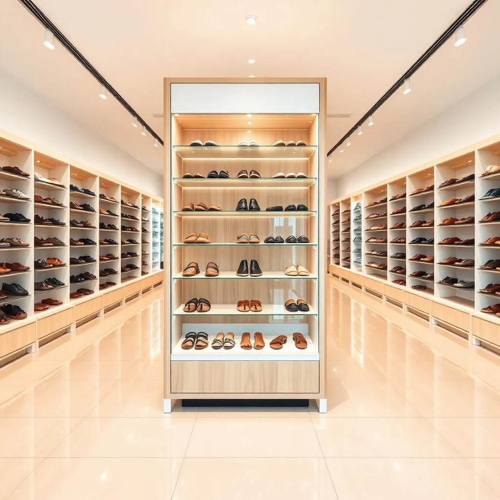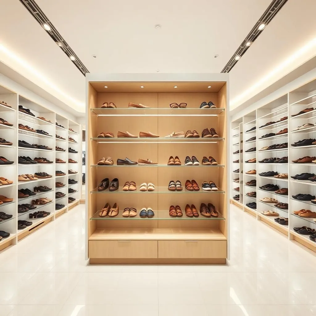 Showroom giày cao cấp: tủ kính kết hợp gỗ, ánh sáng LED sang trọng.