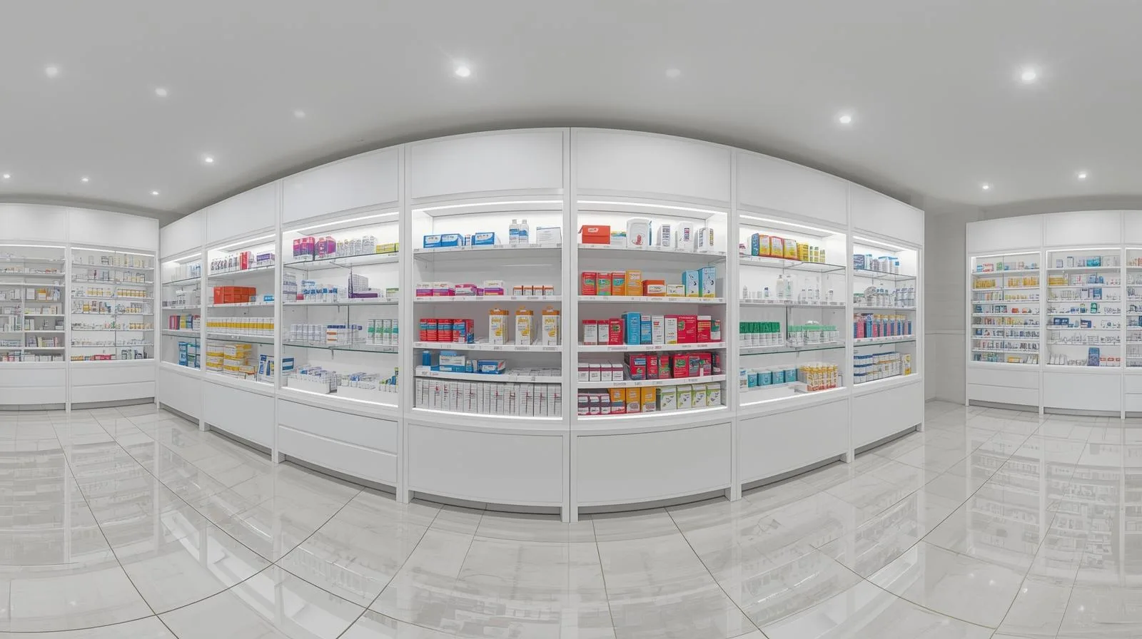 Nhà thuốc tây: trưng bày thuốc kê đơn, OTC, thực phẩm chức năng.