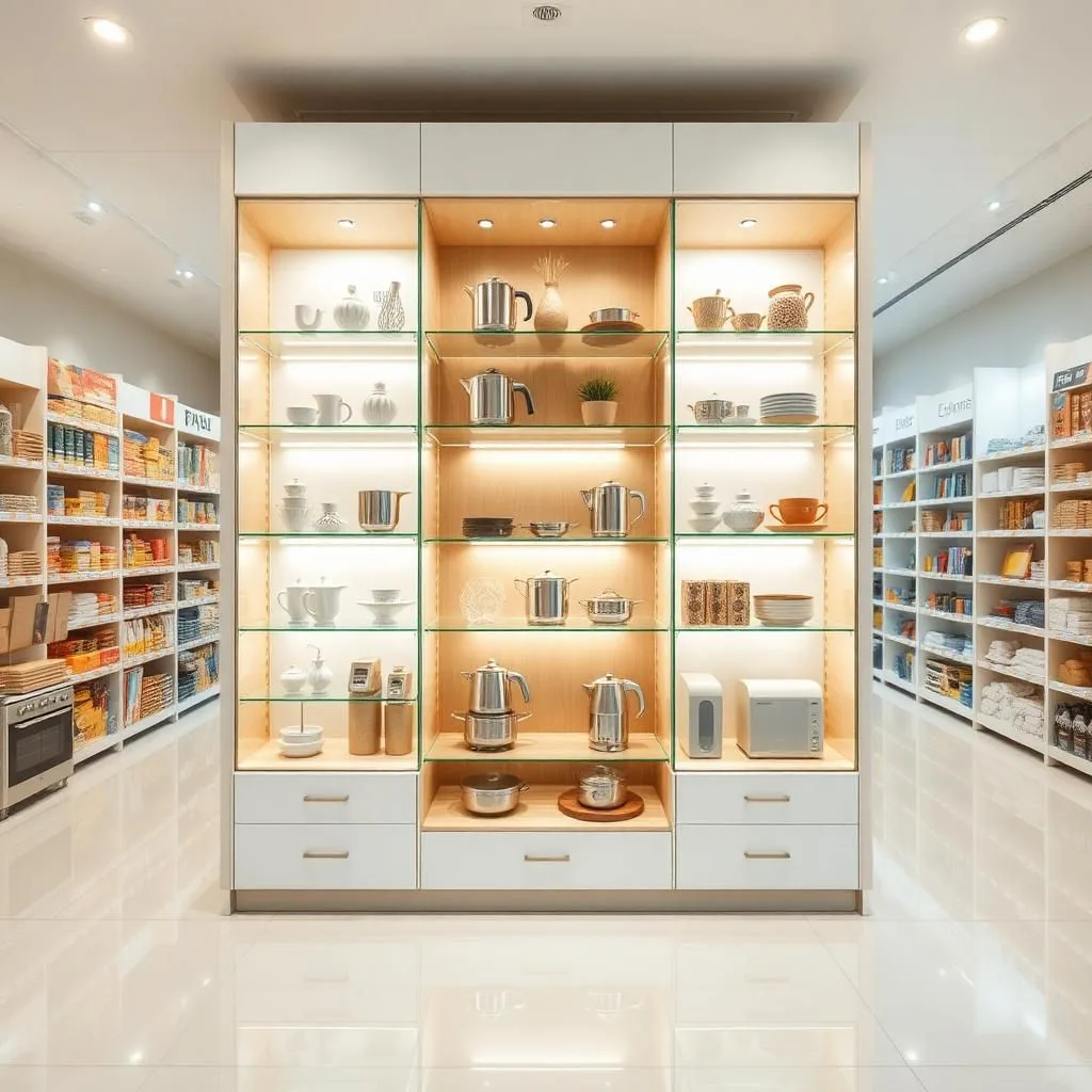 Cửa hàng gia dụng nhỏ: tận dụng tủ đứng nhiều tầng để tối ưu không gian.
