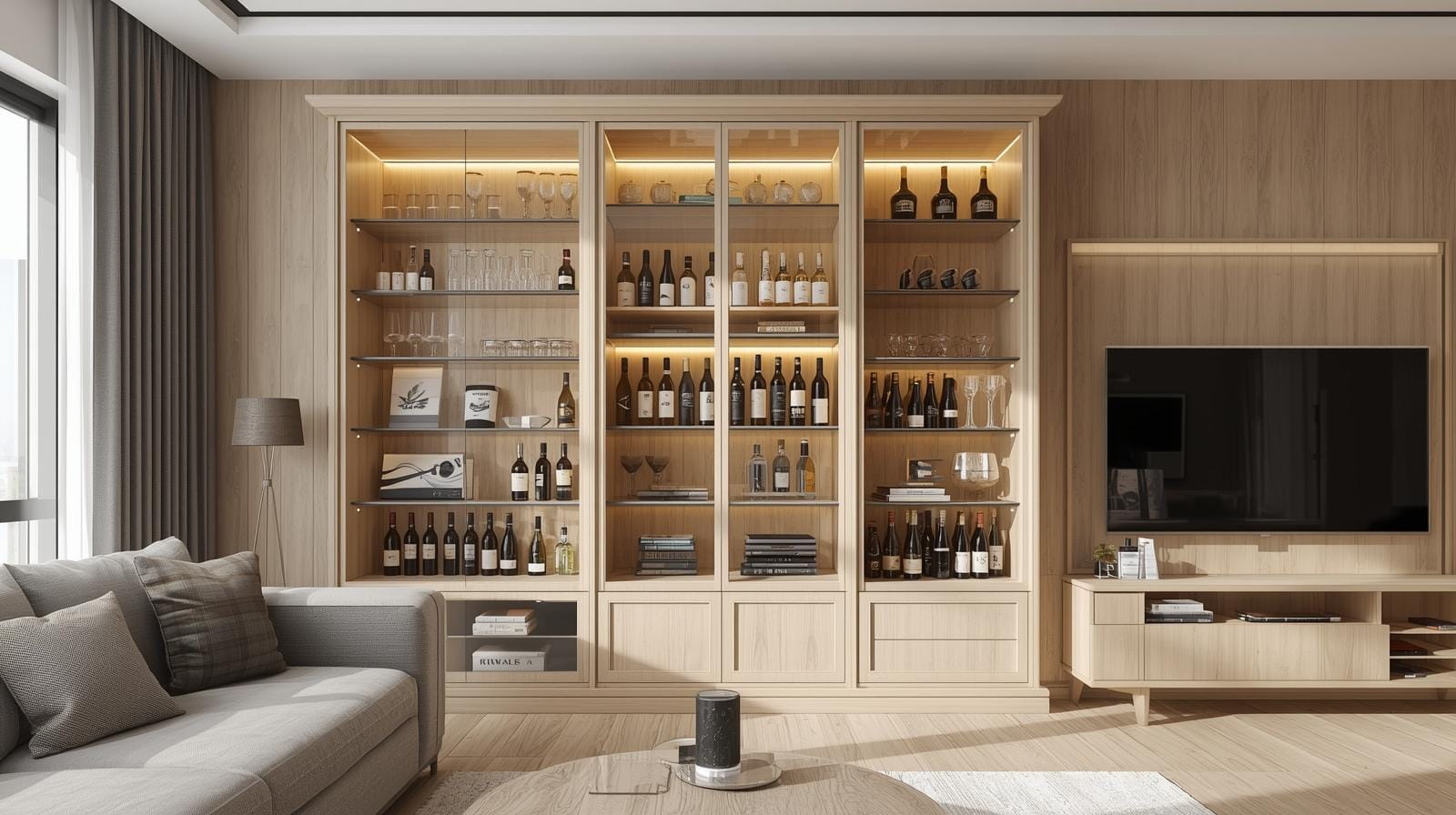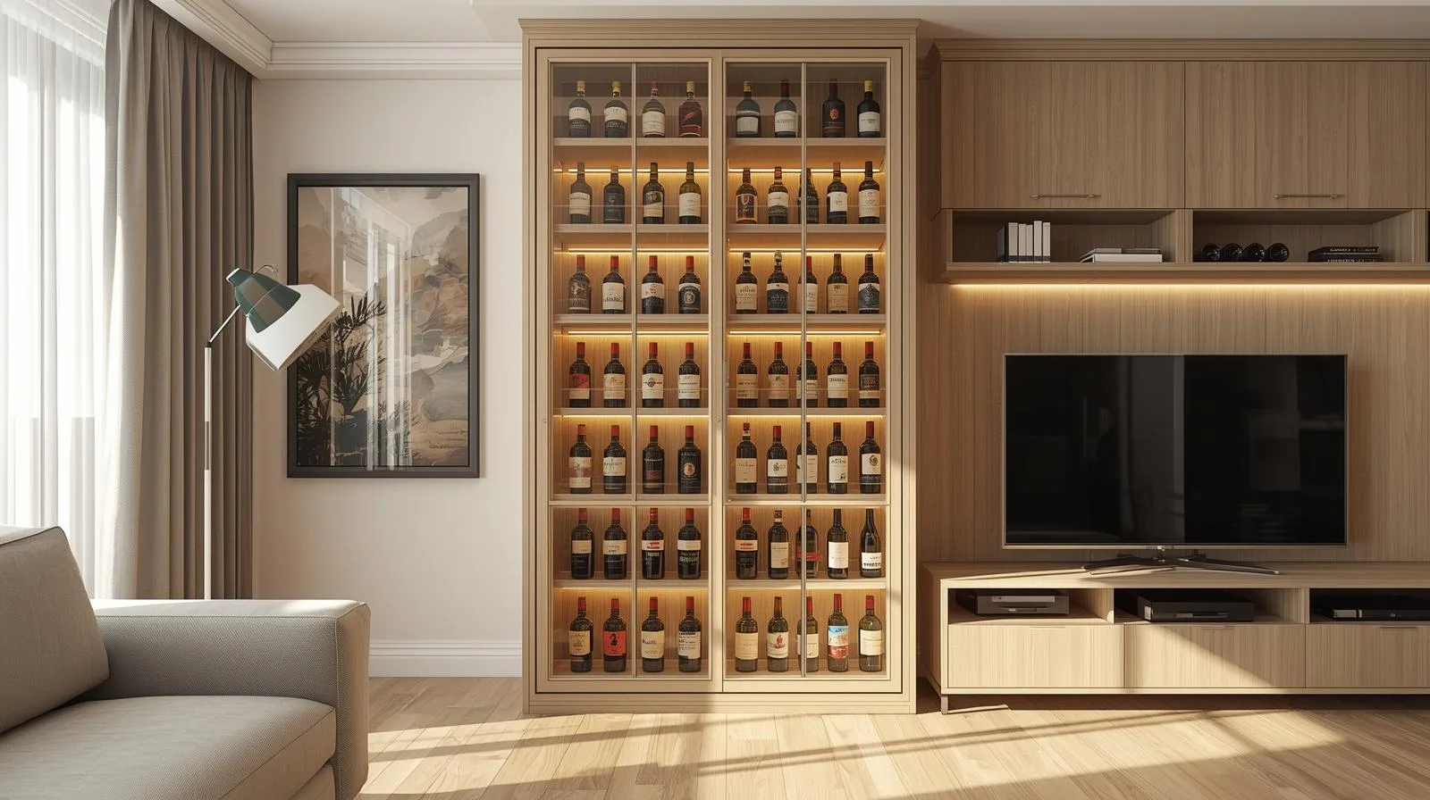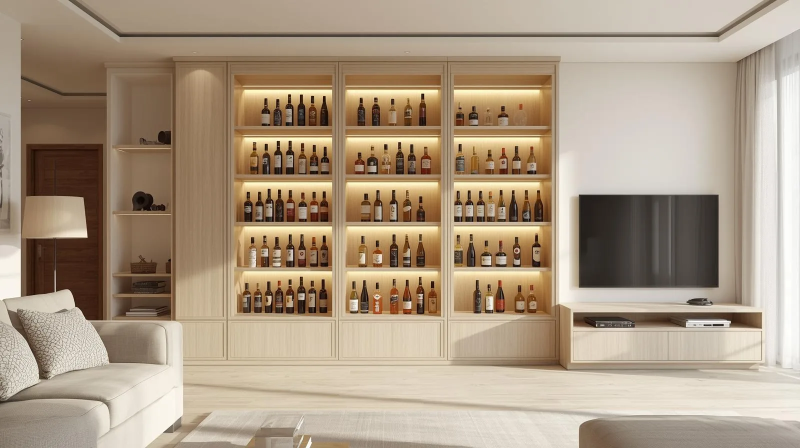 Ánh sáng LED: nên chọn loại ánh sáng vàng hoặc trắng trung tính để làm nổi bật chai rượu mà không gây chói.