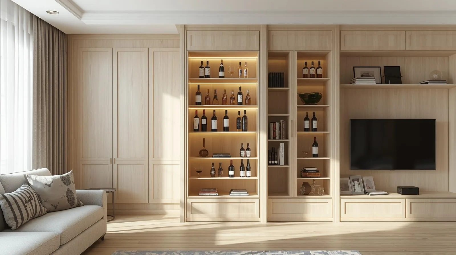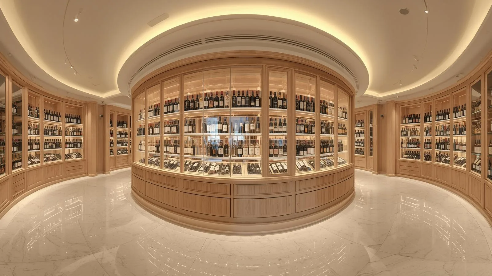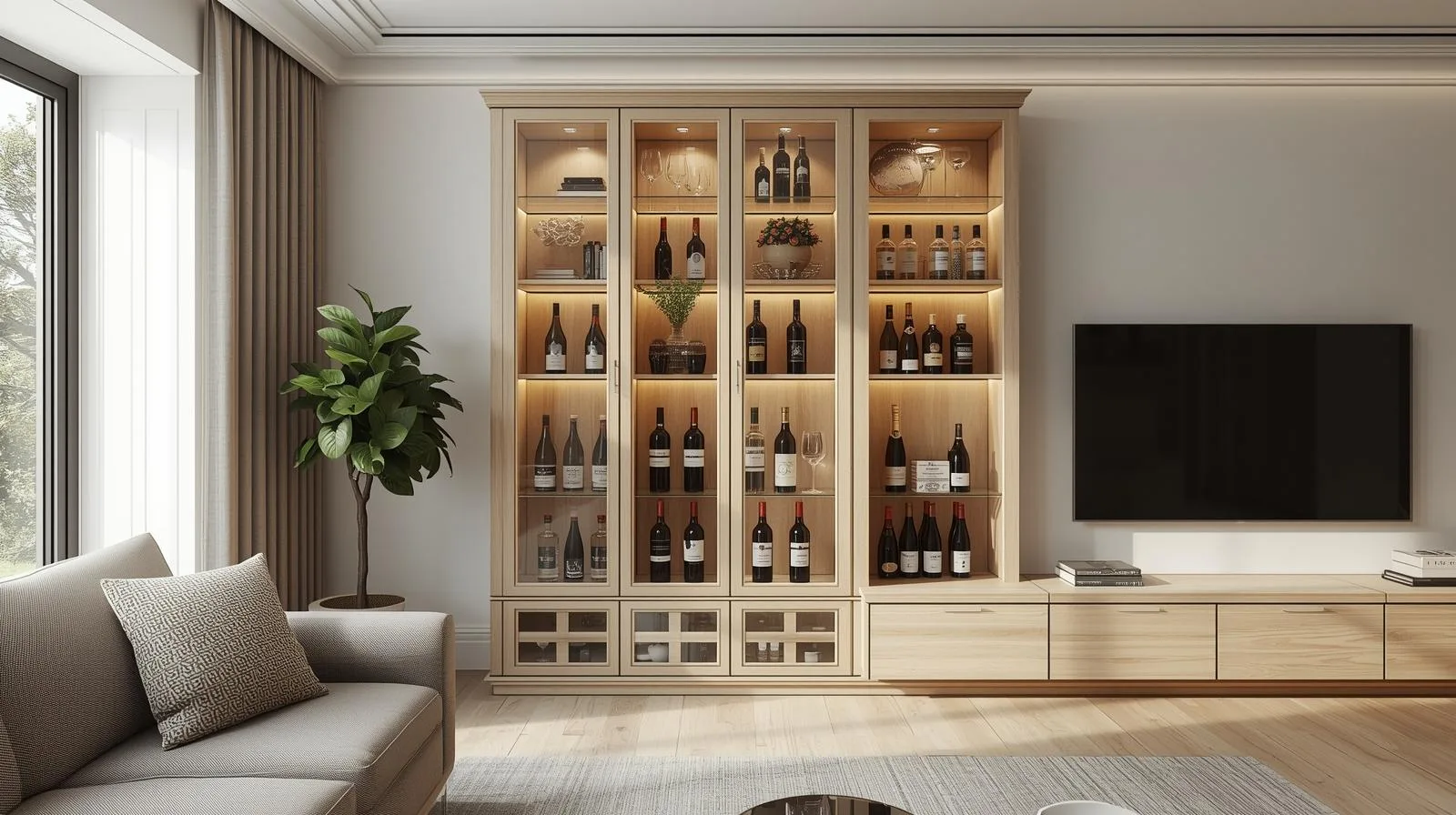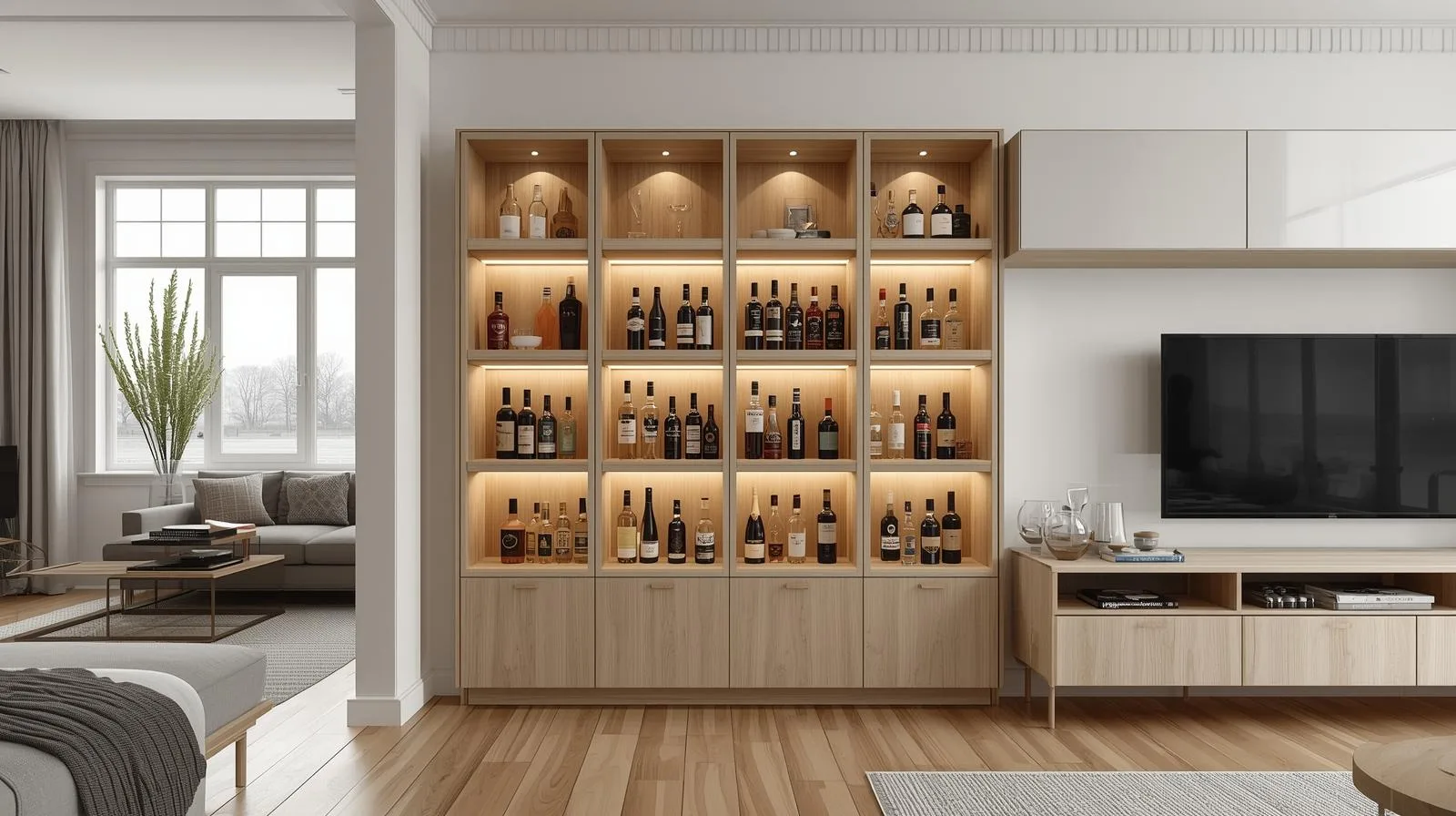 Ánh sáng LED: nên chọn loại ánh sáng vàng hoặc trắng trung tính để làm nổi bật chai rượu mà không gây chói.