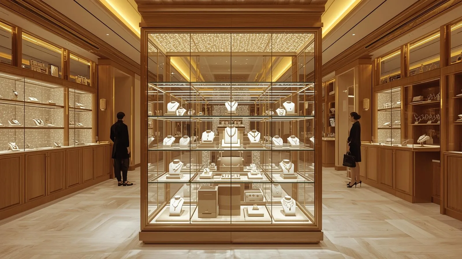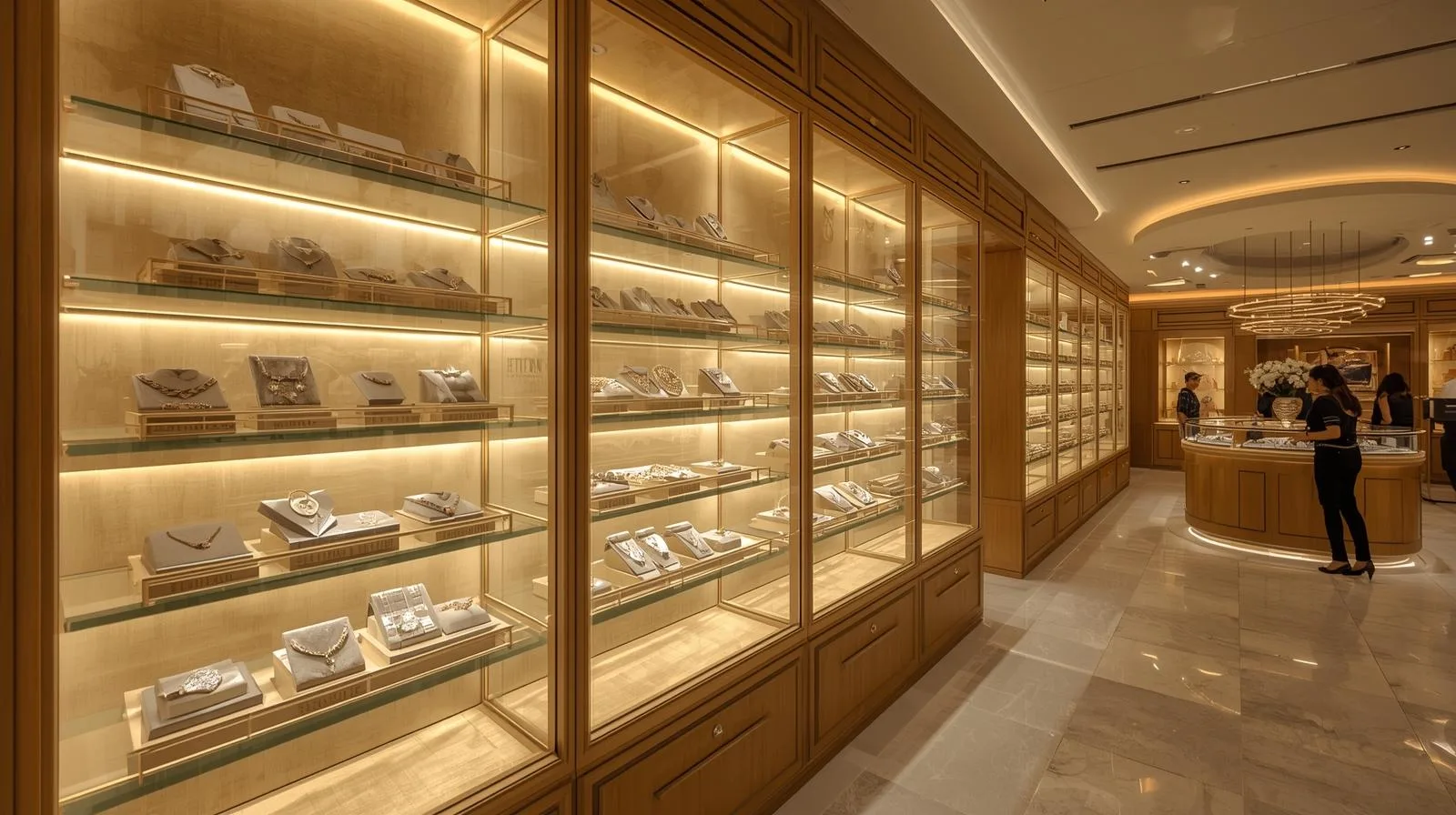 Cửa hàng vàng bạc đá quý: tủ kính bảo mật cao, ánh sáng chuẩn xác.