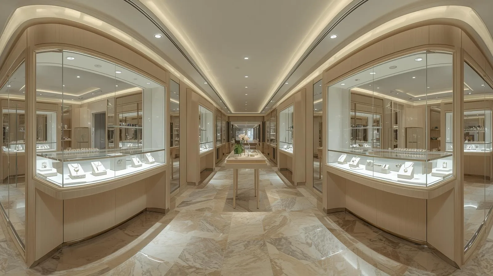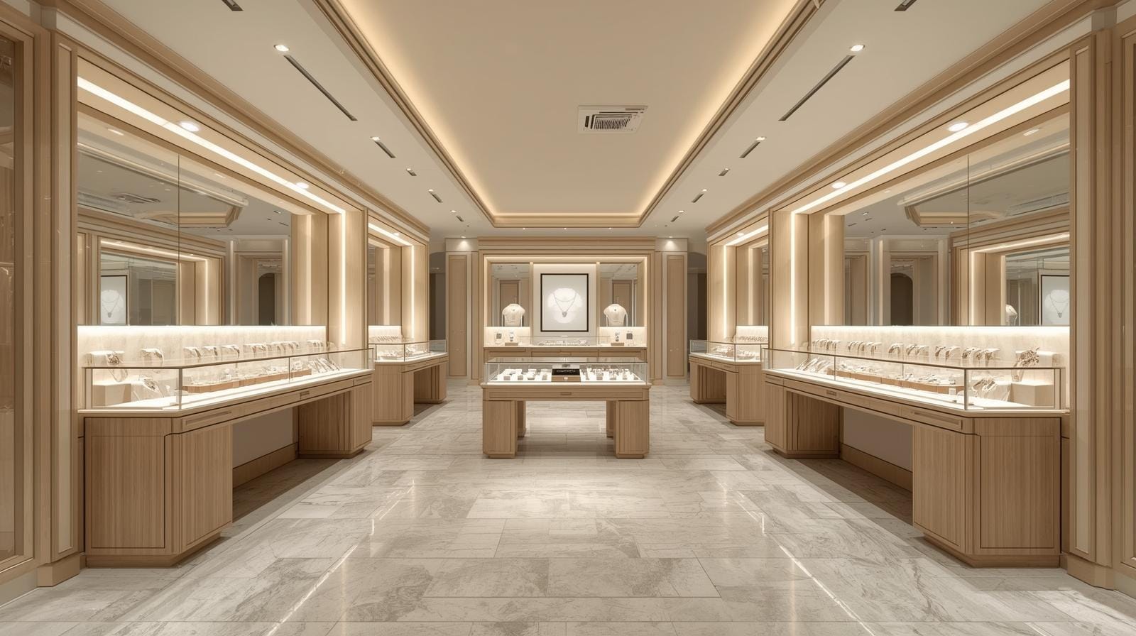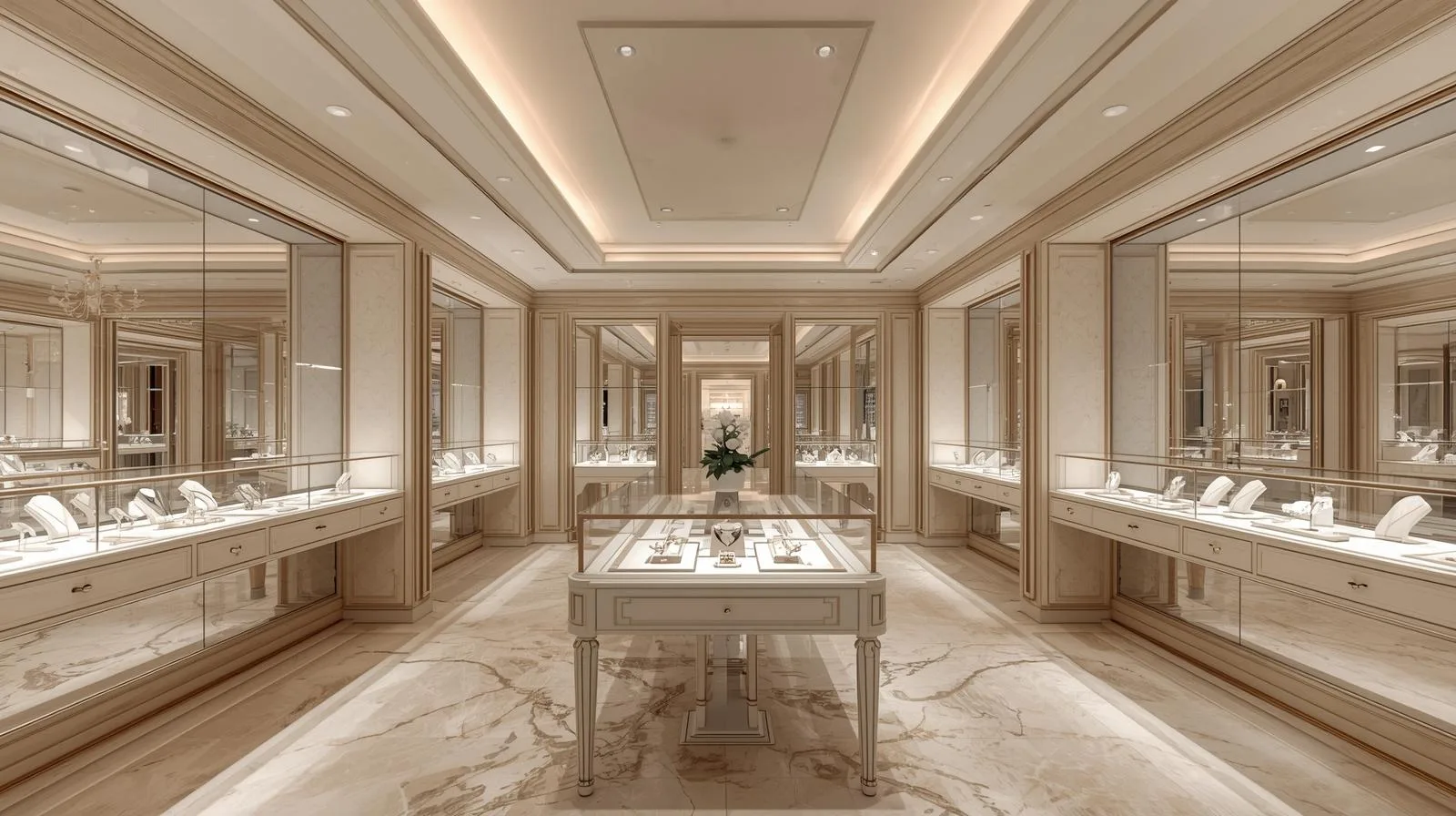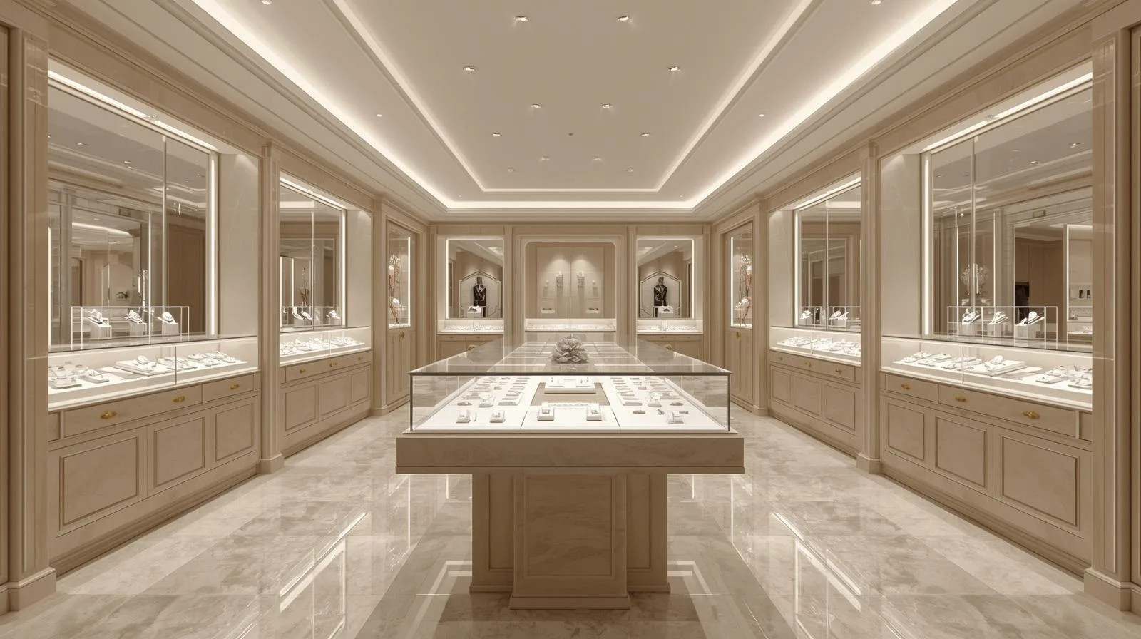 Showroom trang sức cao cấp: tủ inox mạ vàng, kính cường lực, concept luxury.