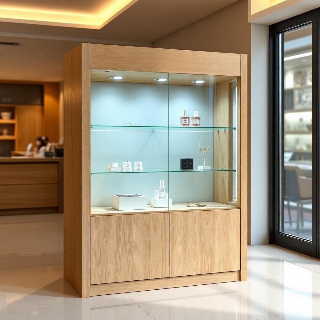 Chú ý chiều cao: Nên chọn tủ cao từ 1.5m – 1.8m để tối ưu trưng bày.