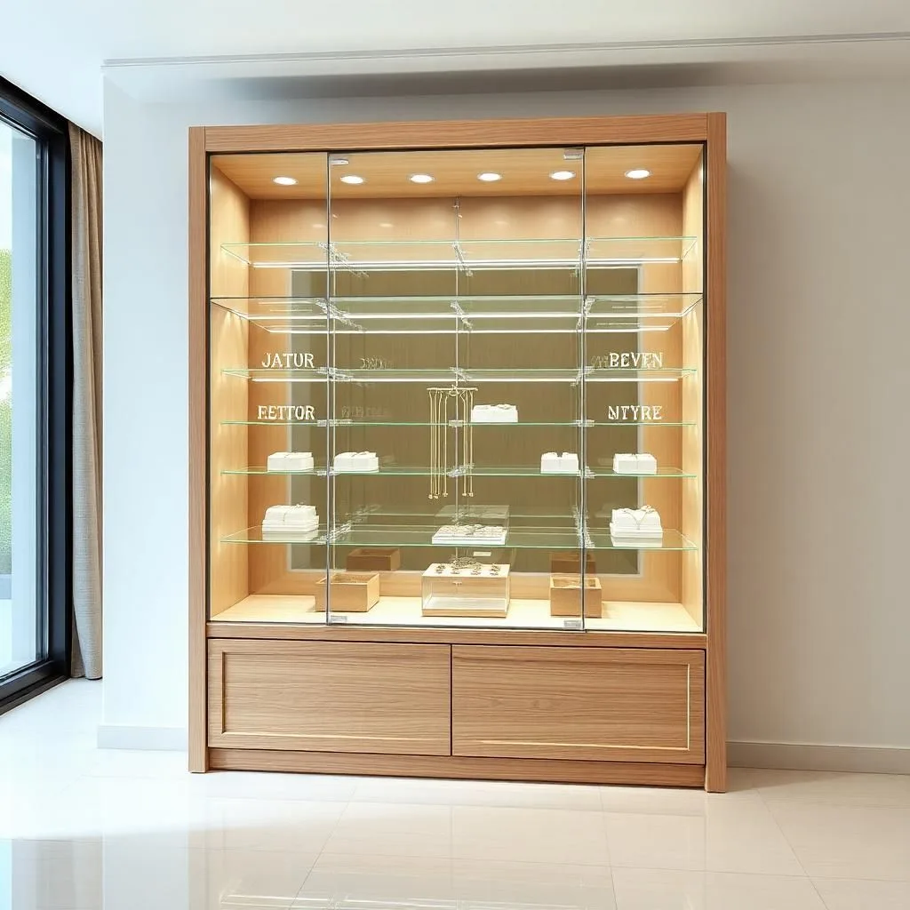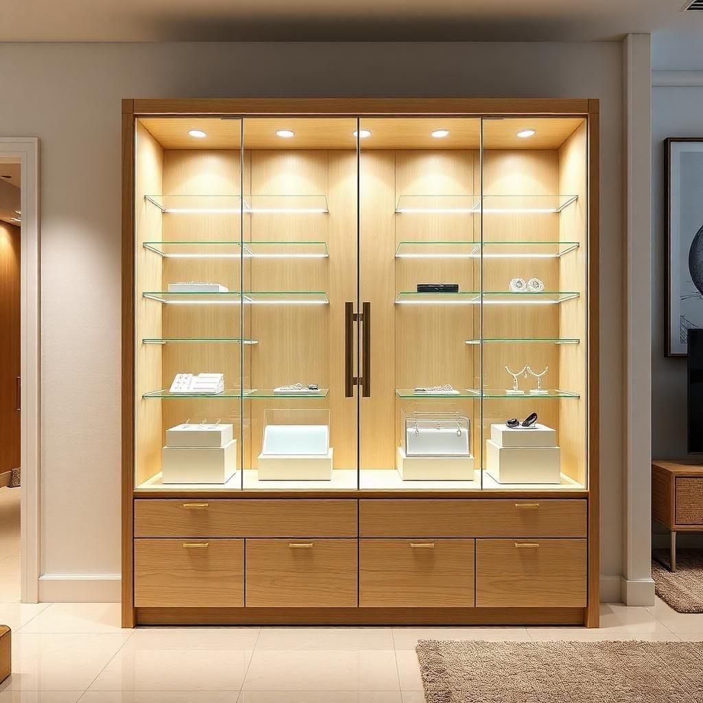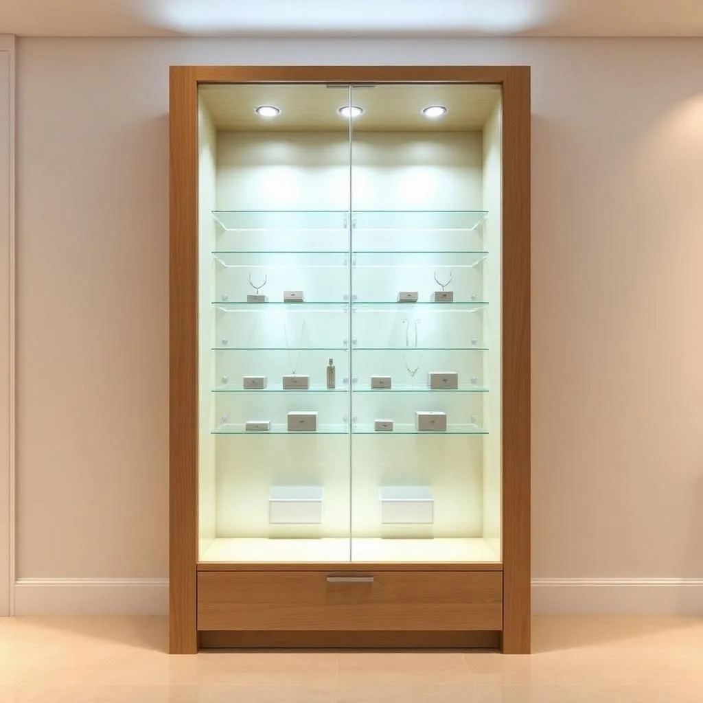 Trang sức, đồng hồ: Nên chọn tủ kính cường lực dày 8–12mm, có gioăng chống bụi kín khít và khóa an toàn. Kết hợp LED vàng giúp sản phẩm lung linh, sang trọng.