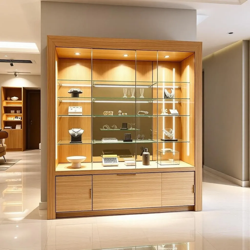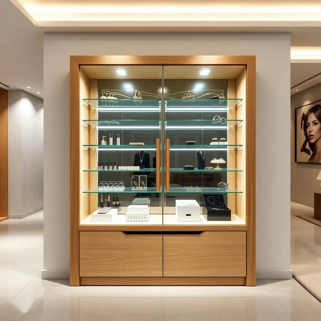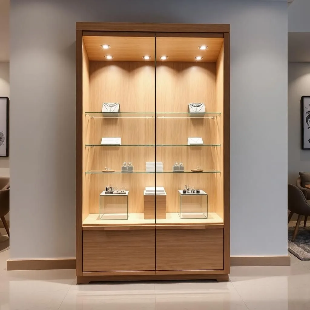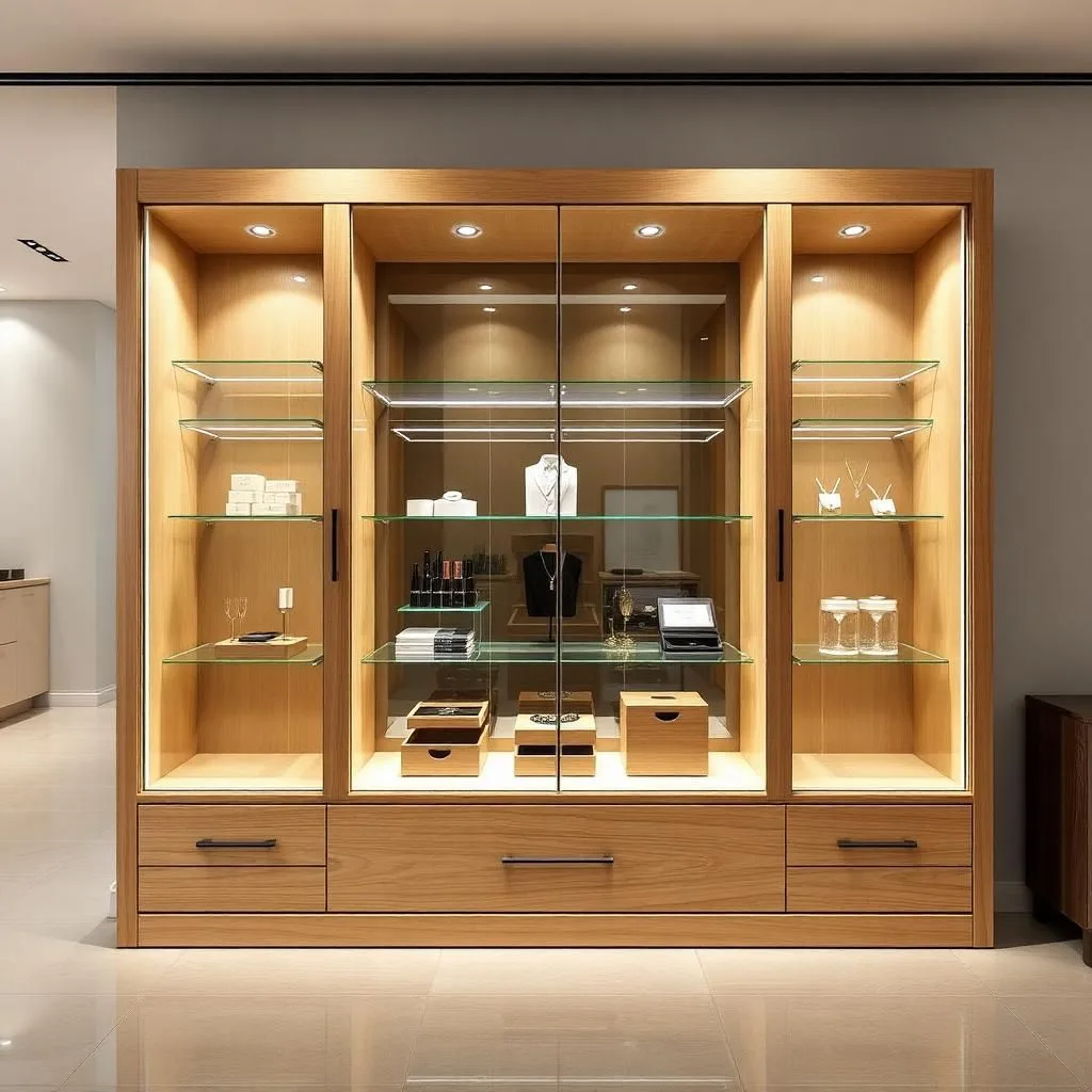 Trang sức, đồng hồ: Nên chọn tủ kính cường lực dày 8–12mm, có gioăng chống bụi kín khít và khóa an toàn. Kết hợp LED vàng giúp sản phẩm lung linh, sang trọng.