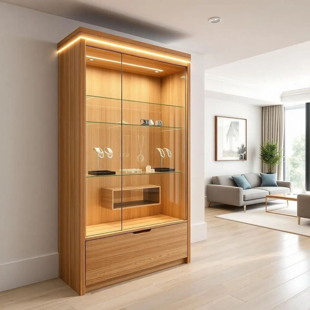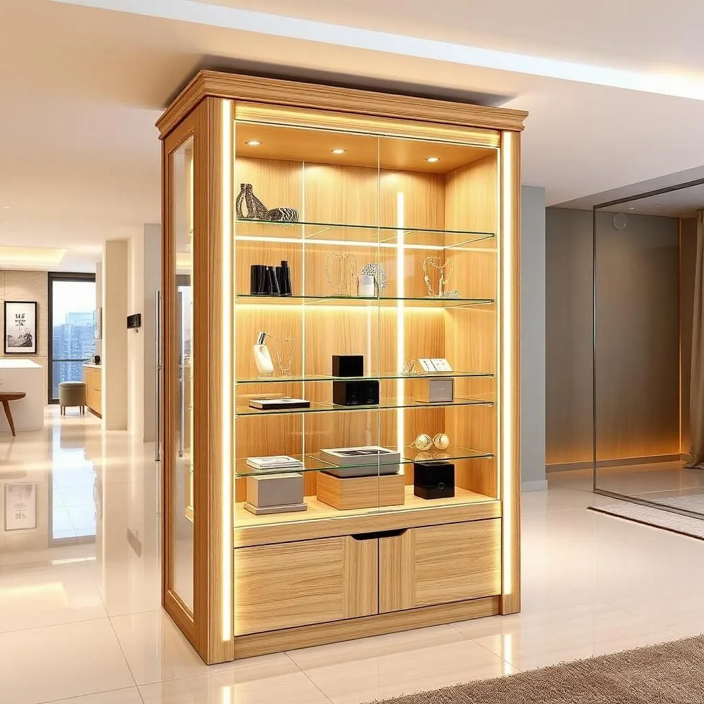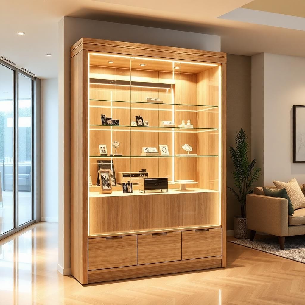 Tủ kính LED vàng ấm, khung gỗ Veneer óc chó, tích hợp khóa an toàn.
