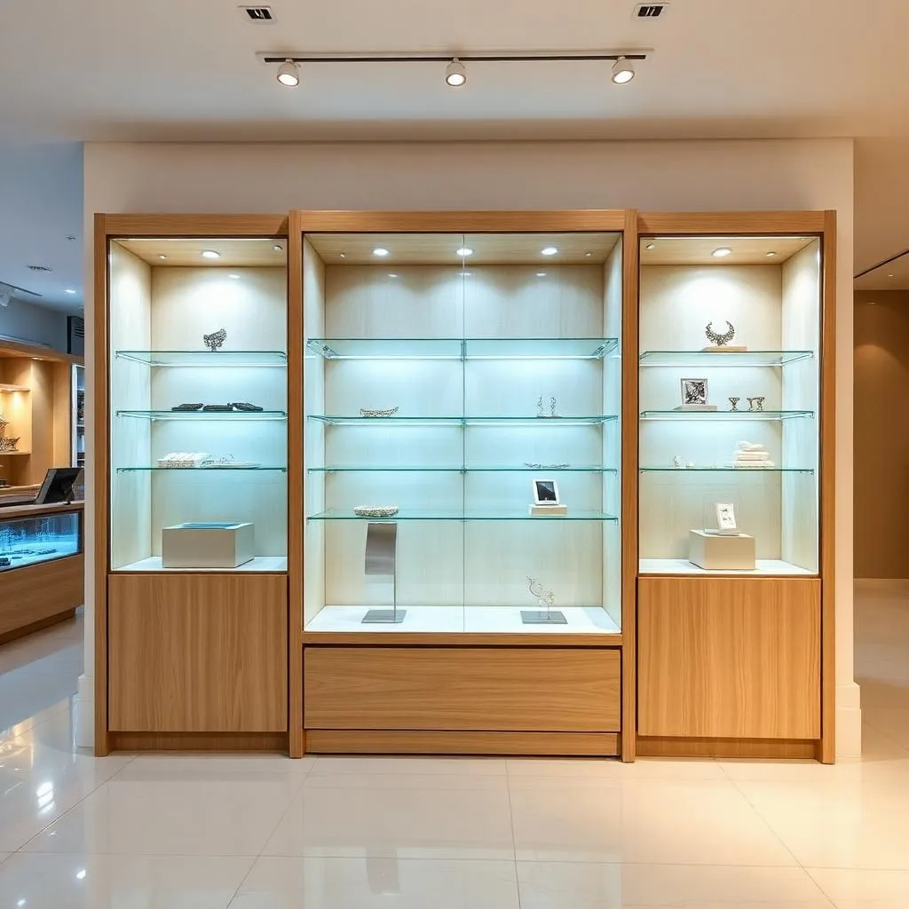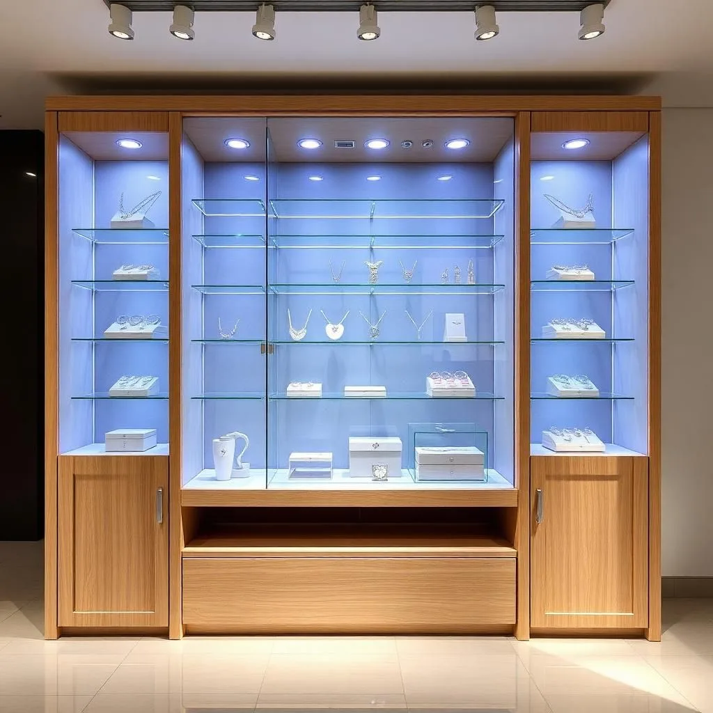 Trang sức – đồng hồ: Nên chọn tủ kính cường lực 10–12mm + LED vàng ấm + khóa an toàn để vừa nổi bật sản phẩm vừa bảo mật.