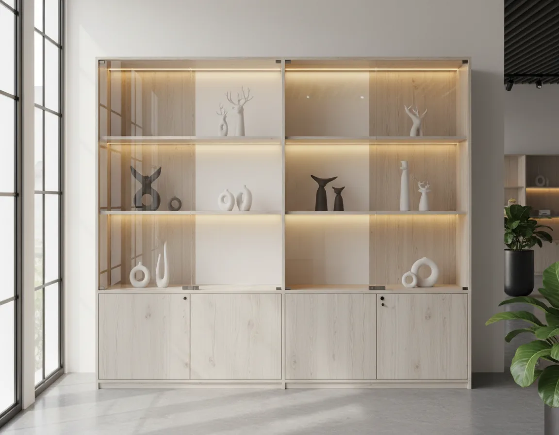 Dòng tủ này thường có kích thước lớn, nhiều tầng, nhiều ngăn, thiết kế đồng bộ với tổng thể nội thất. Tủ trưng bày showroom yêu cầu cao về độ bền, khả năng chịu lực và tính thẩm mỹ lâu dài.