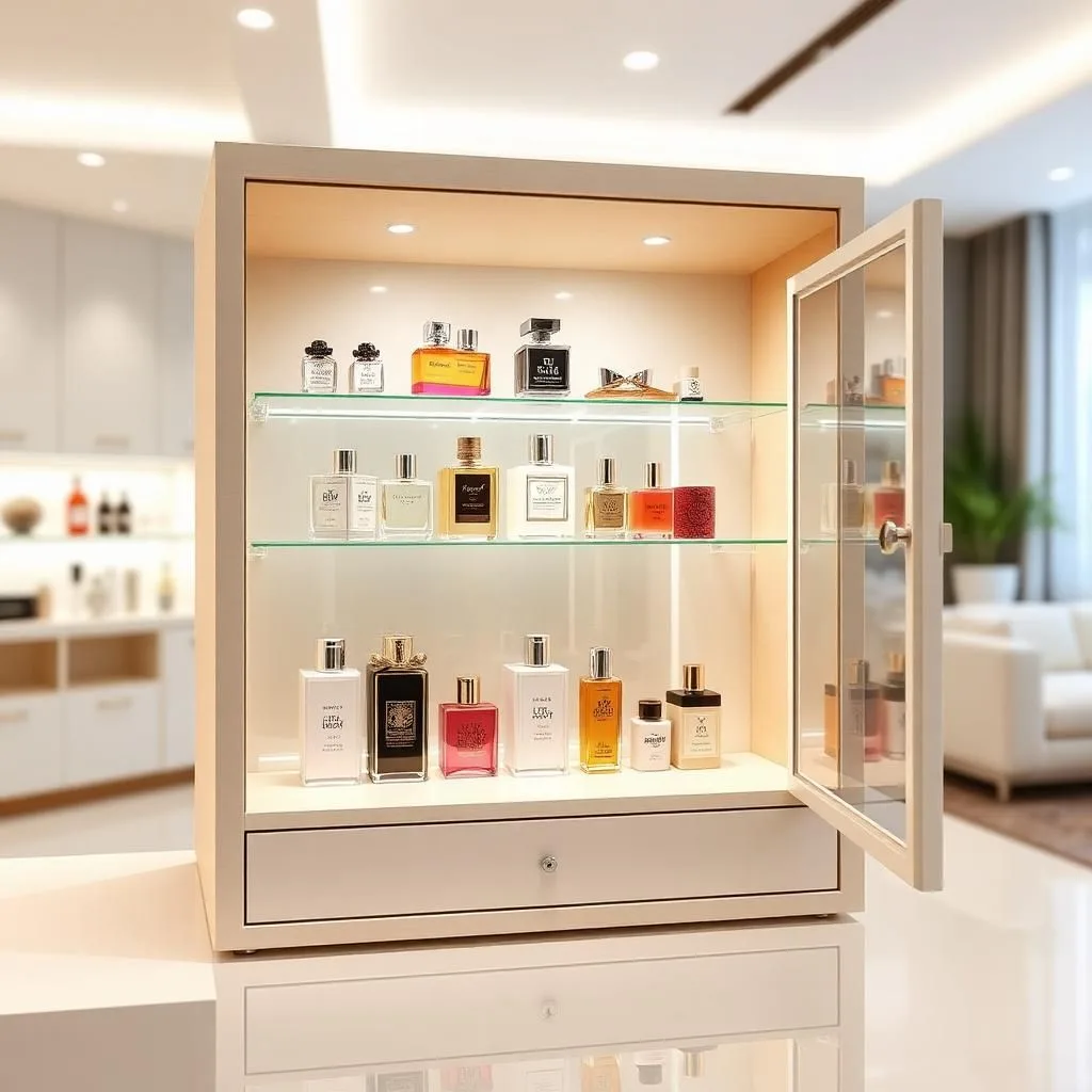 Một trong những lĩnh vực sử dụng tủ trưng bày mini phổ biến nhất chính là cửa hàng mỹ phẩm. Những sản phẩm như son môi, kem dưỡng da, nước hoa hay phụ kiện trang điểm thường có kích thước nhỏ nên rất phù hợp trưng bày trong tủ mini. Khi kết hợp với kính trong suốt và hệ thống đèn LED, sản phẩm sẽ trở nên nổi bật và thu hút ánh nhìn của khách hàng.